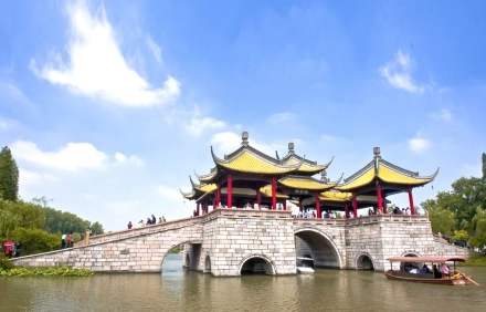 莲花桥,又称五亭桥,位于白塔以北,横亘瘦西湖南北两岸,形状象一朵盛开的莲花。桥墩以青石砌筑,桥墩下共开十五券洞,从东西两立面观之,每面各有五洞,大小不一,形状各异。清代《平山堂图志》记载:“桥上置五亭,下列四翼,洞正侧凡十有五,月满时每洞各衔一月,金色滉漾,卓然殊观”,正是桥墩的别致造型带来的独特审美体验。莲花桥造型独特,桥墩与桥亭变化丰富,是中国古代桥梁建筑中颇具审美特征的优秀作品,曾被中国著名桥梁专家茅以升誉为“中国最秀美的桥”。
