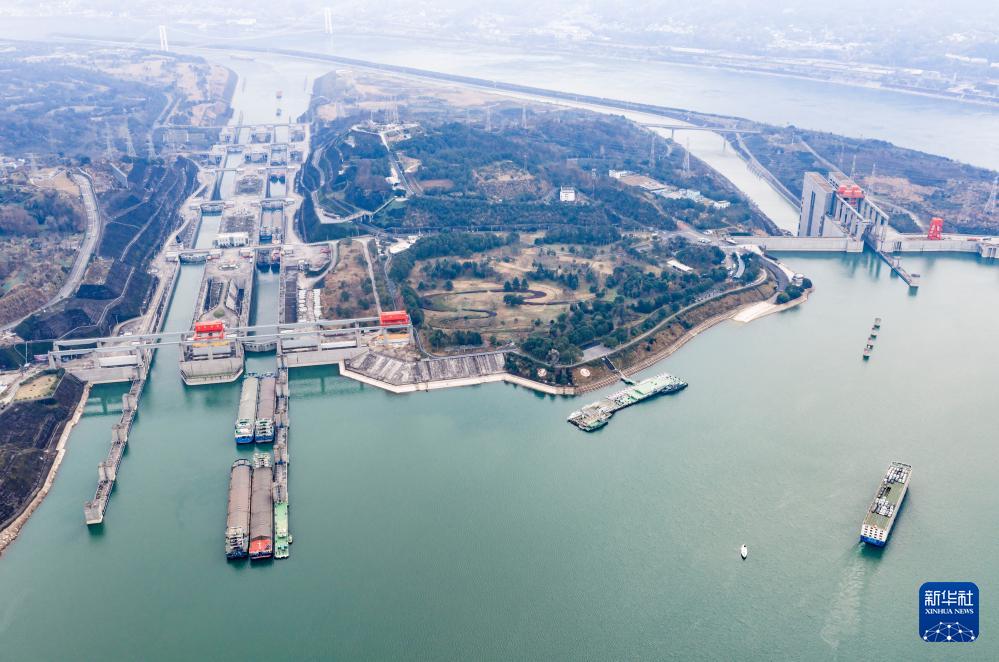 2026年1月1日,船舶有序通过三峡双线五级船闸和升船机(无人机照片...