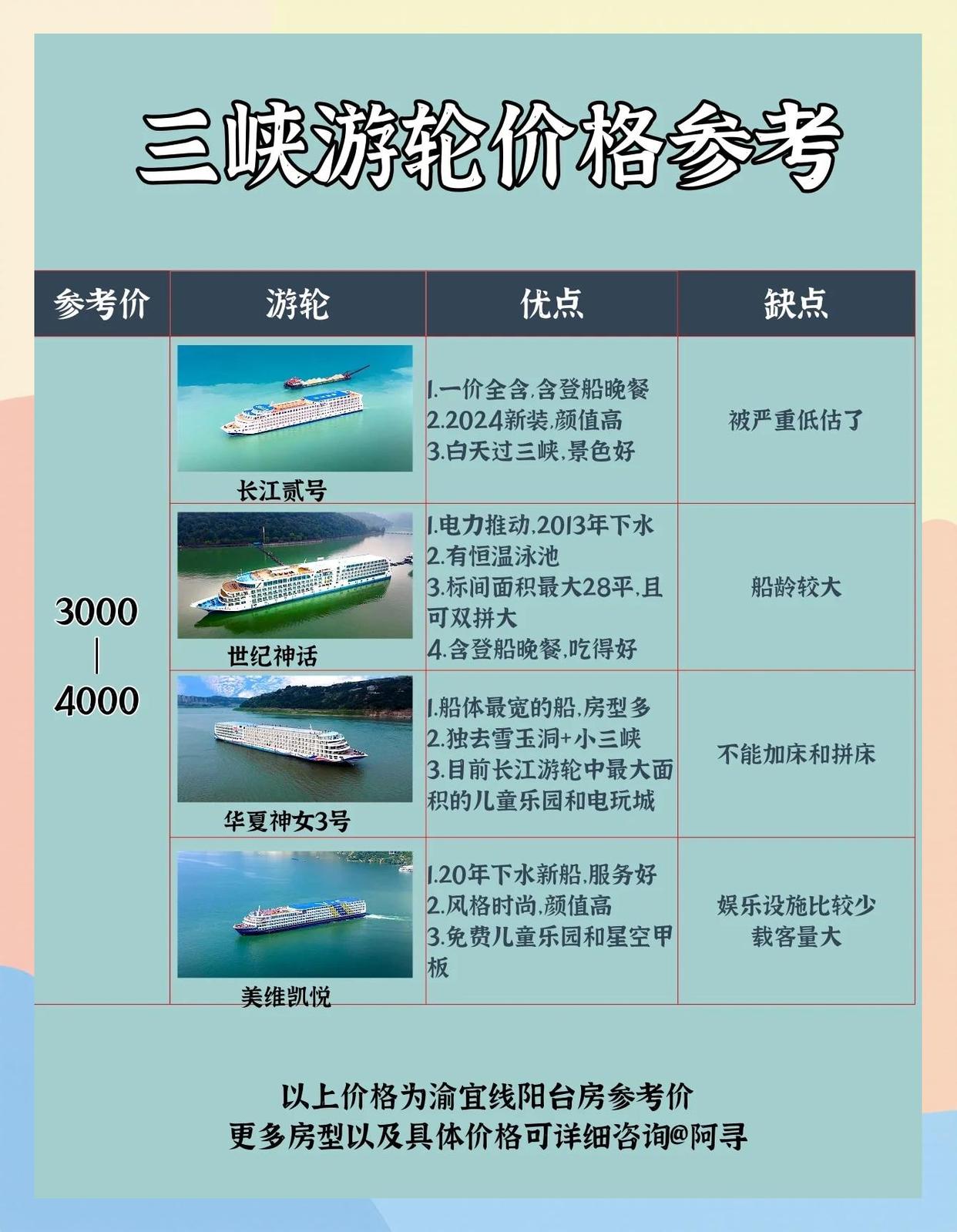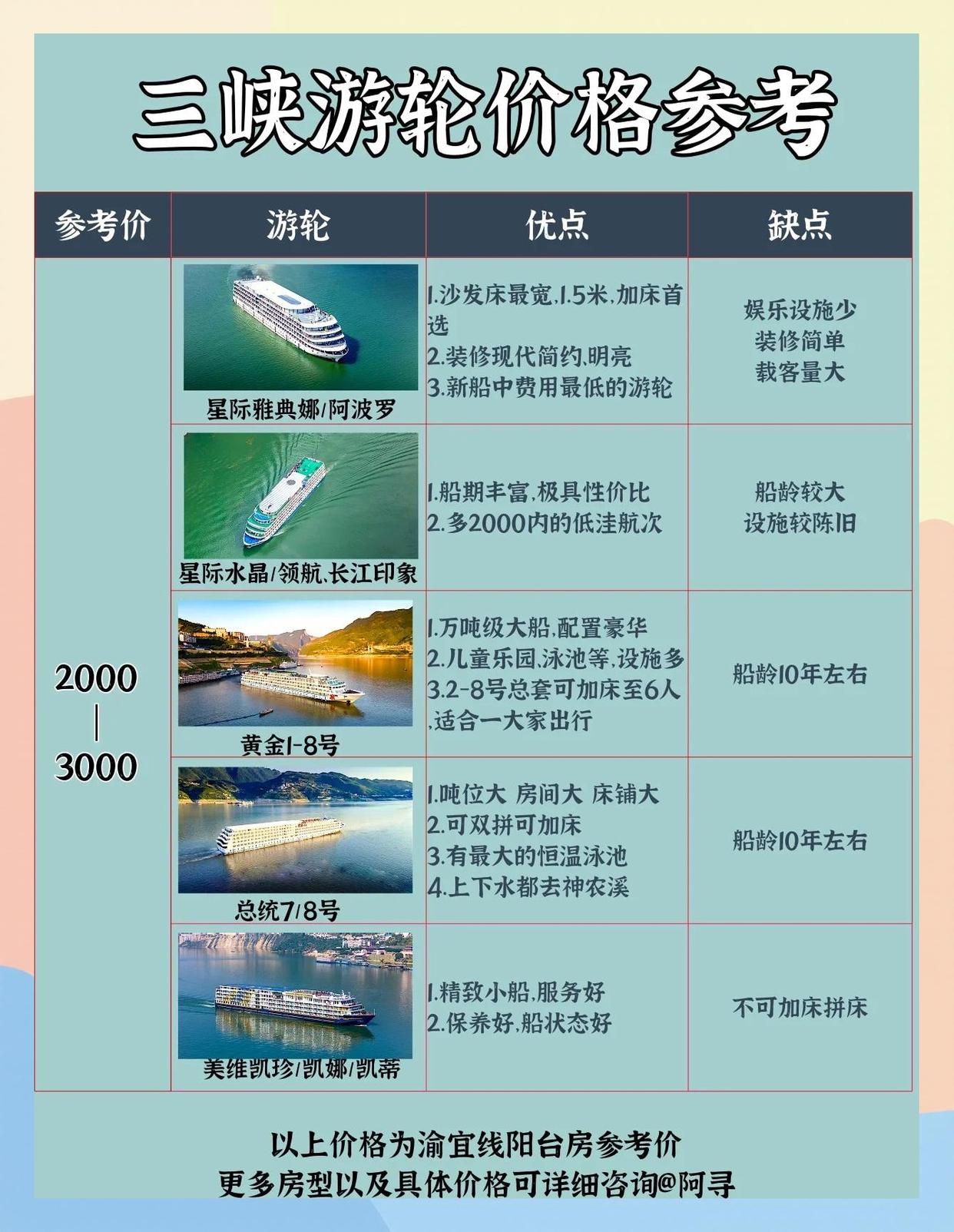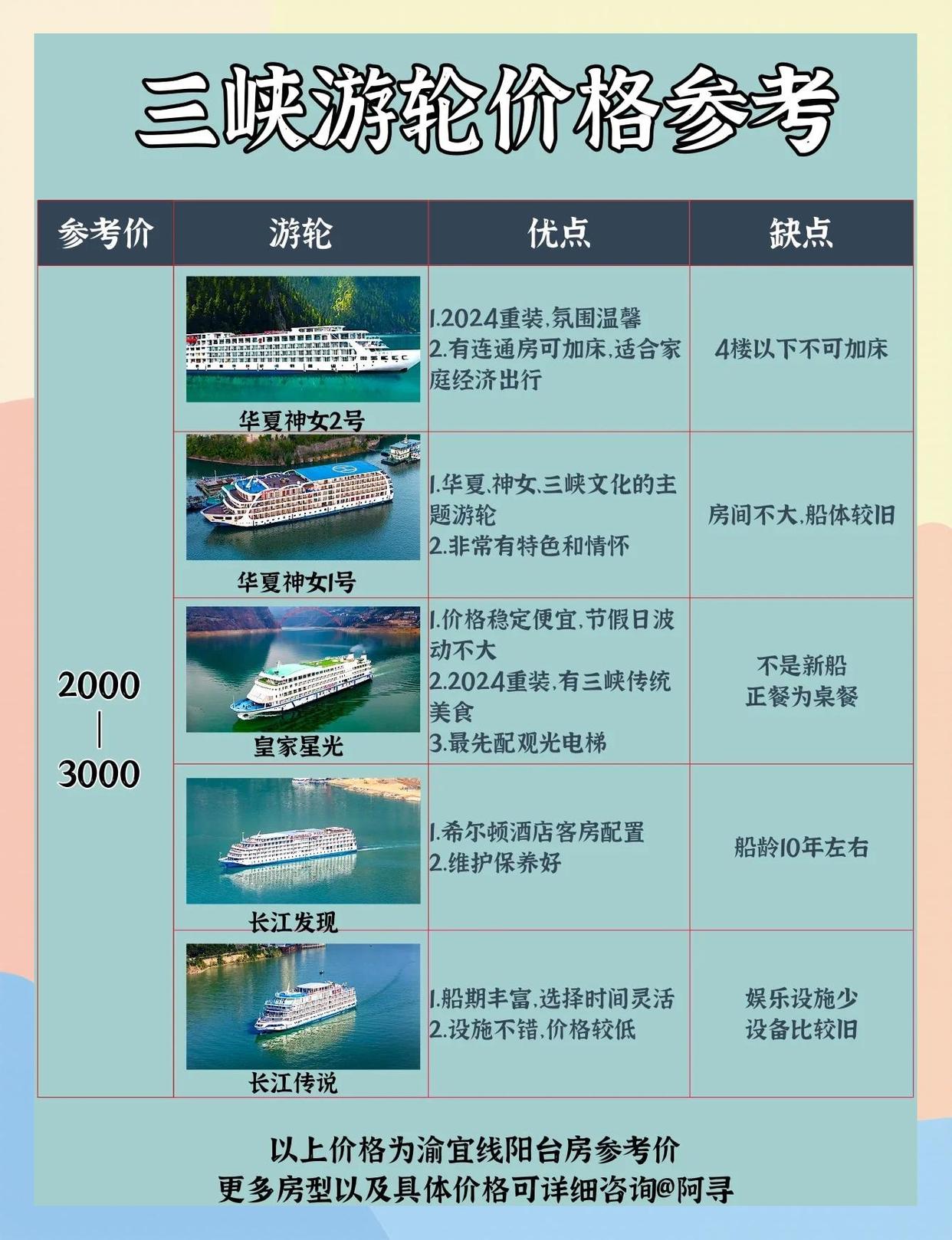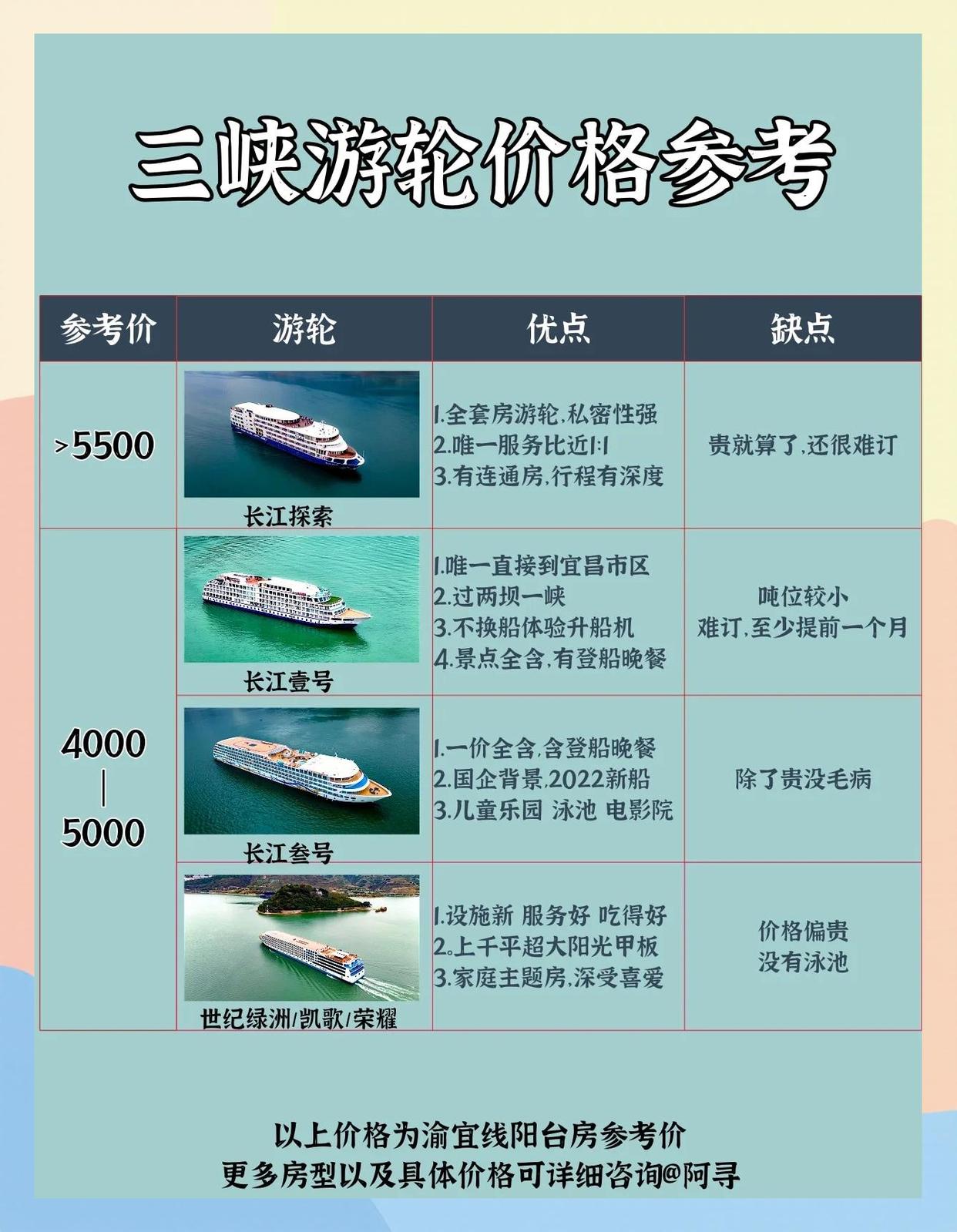 ![]() ![]() ![]() ![]() ![]() ![]() ![]() 总统2号(下水) 皇家三国(下水) 皇家盛世(下水) 长江孚泰(下水) 新高湖 维多利亚3号(下水) 3天2晚的游轮: 美维凯琳、凯莎、凯蕾 黄金2号 长江观光 皇家三国、盛世 总统7号 长江孚泰 总统1号 总统2号(下水) 维多利亚3号(下水) 价格参考: 💸 >5500元:长江探索 💸 4000-5000元:长江壹号、长江叁号、世纪绿洲、凯歌、荣耀 💸 3000-4000元:长江贰号、世纪神话、华夏神女3号、美维凯悦 💸 2000-3000元:星际游轮、黄金游轮、总统7/8号、美维凯蒂、凯娜、凯珍、华夏神女2/1号、长江发现、长江传说、皇家星光 💸 1500-2000元:美维凯莎、凯琳、凯蕾、总统1号、总统2号、维多利亚3号 💸 1000元左右:长江孚泰、长江观光、皇家三国、盛世、新高湖 希望这些信息能帮到你,祝你旅途愉快!如果有更多问题,欢迎留言哦! |