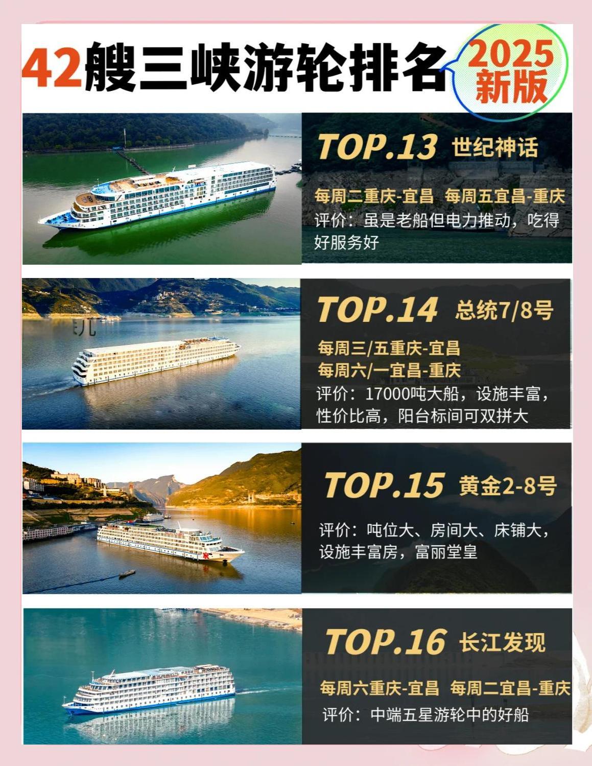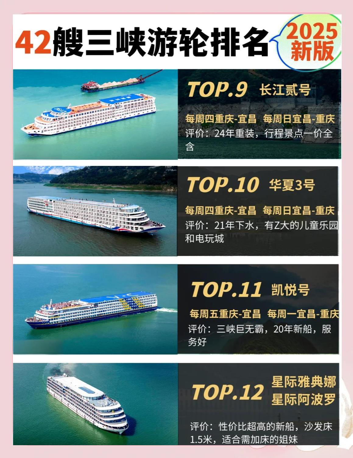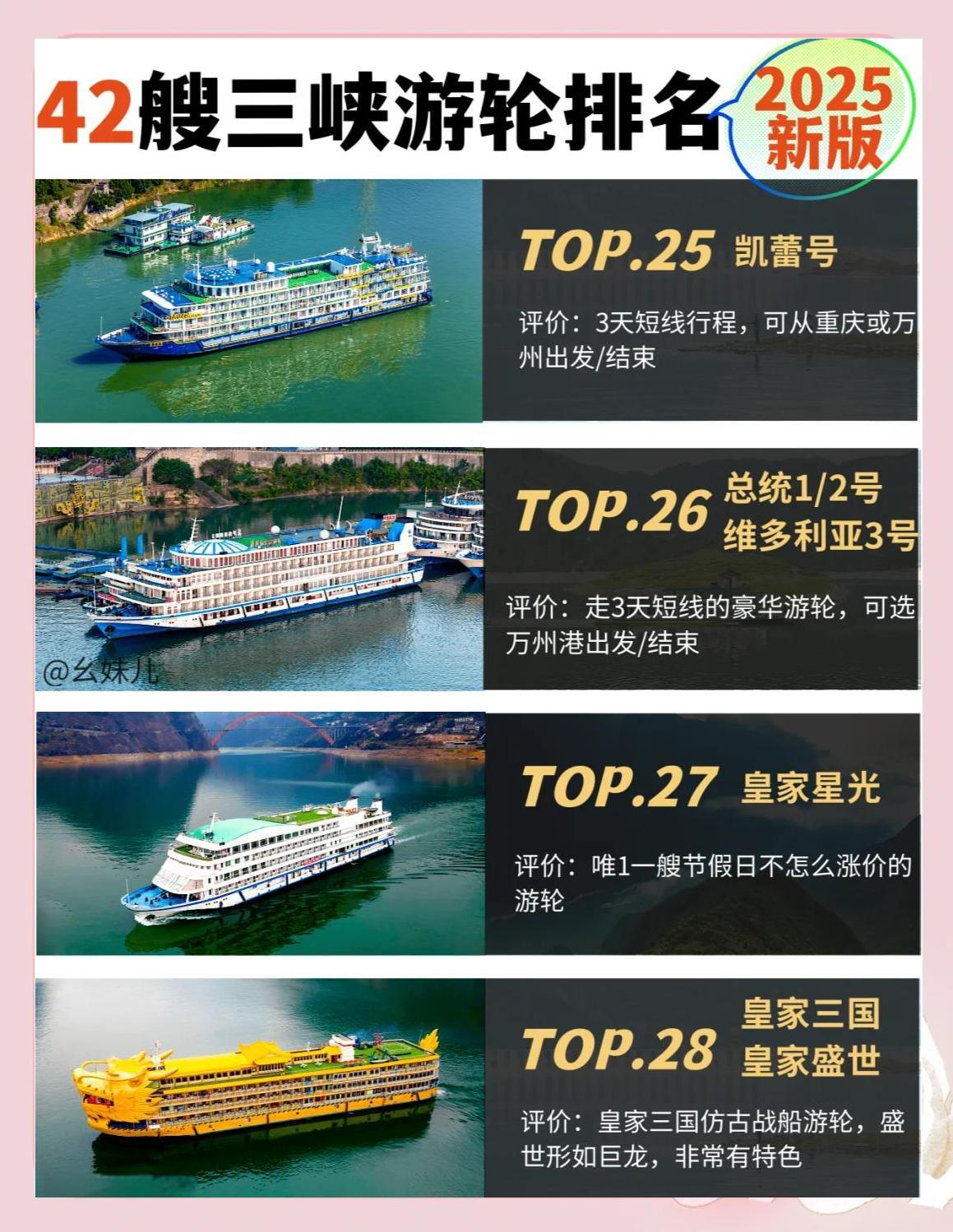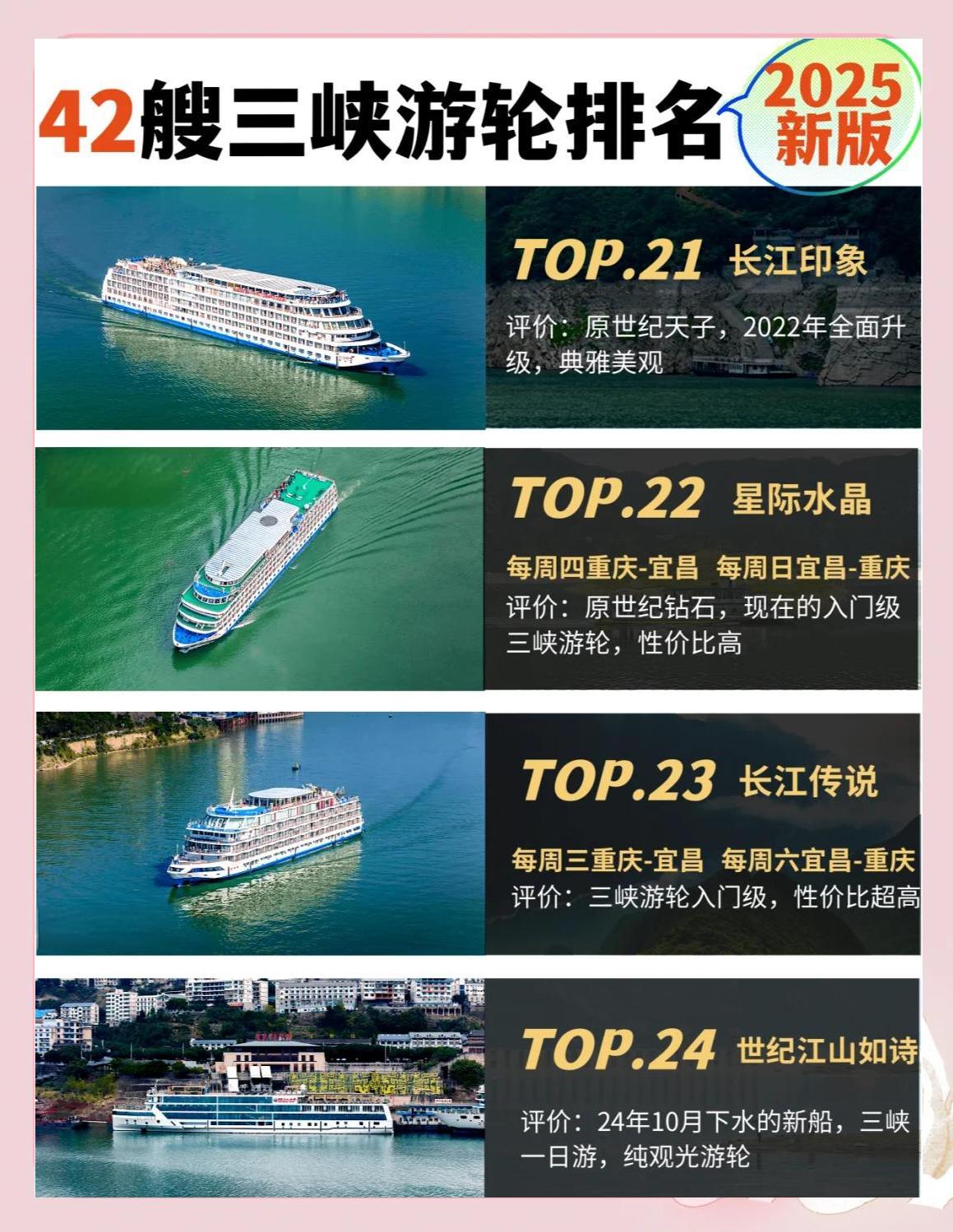 2025年,三峡游轮将迎来一波更新换代,四五艘老船将退役,同时将有两艘全新游轮加入。那么,哪艘船将成为新的“船王”呢?以下是2025年三峡游轮的最新排名: