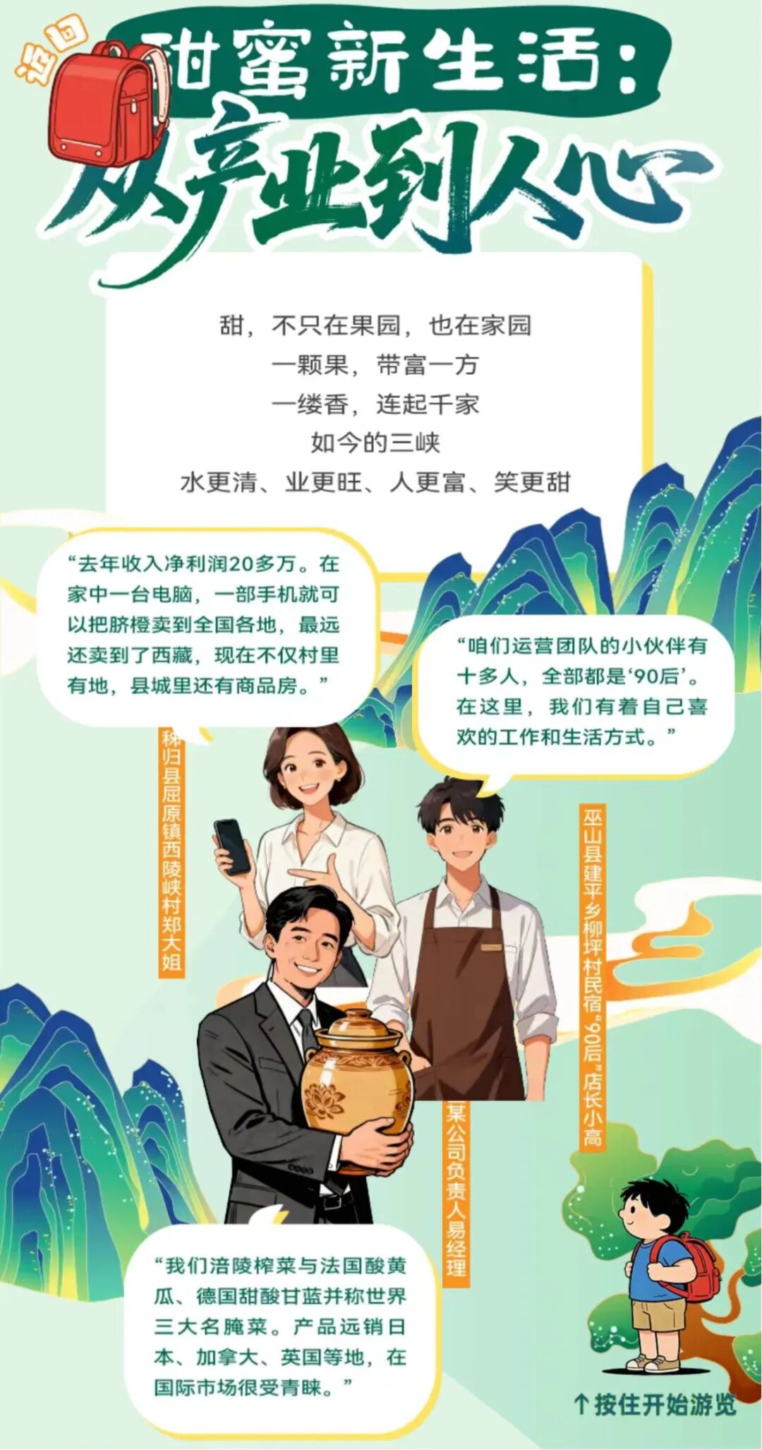 《一江丰景,多味三峡》,从味道出发,呈现一江水岸之上,产业稳步生长的当下图景。还可以选择你喜欢的三峡味道,生成专属海报,分享给朋友们,一起来“味”游三峡吧!
